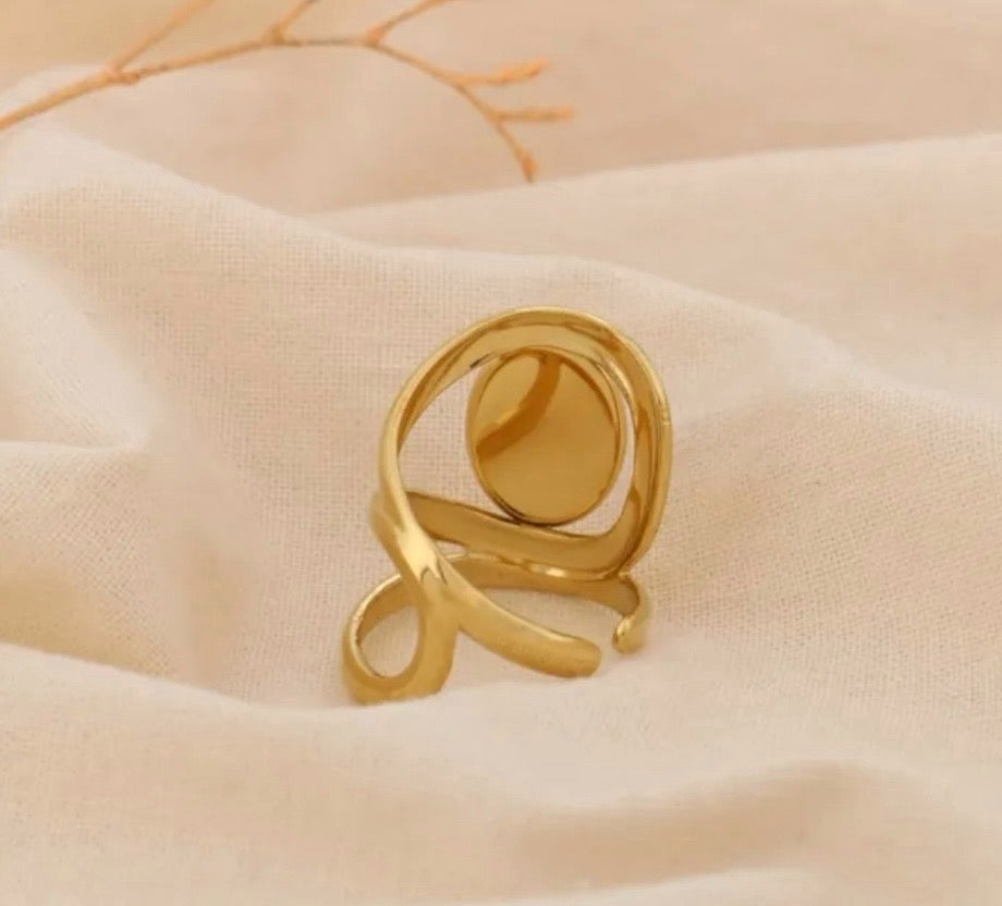 Laissez-vous séduire par cette bague en acier inoxydable doré, véritable pièce de caractère grâce à son design sculptural aux courbes élégantes et organiques. Son anneau ajustable offre un confort parfait et s’adapte à toutes les tailles de doigts.