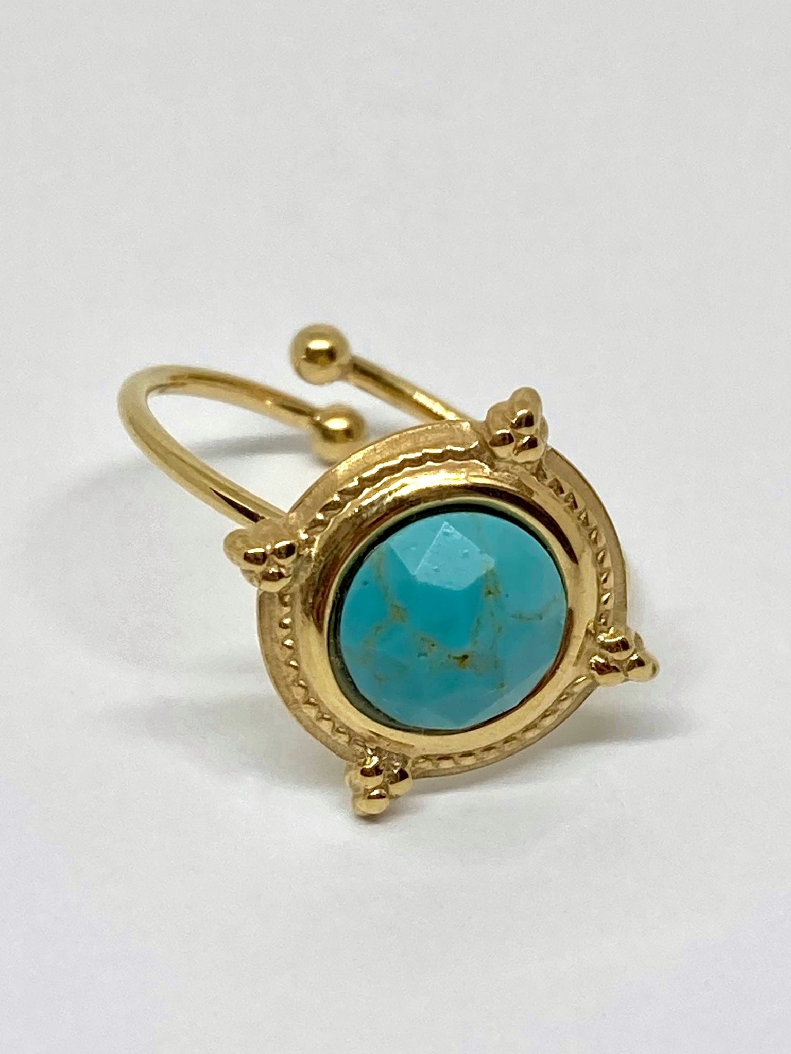 En acier inoxydable doré, elle est ornée d’une turquoise africaine sertie dans une délicate couronne dorée.