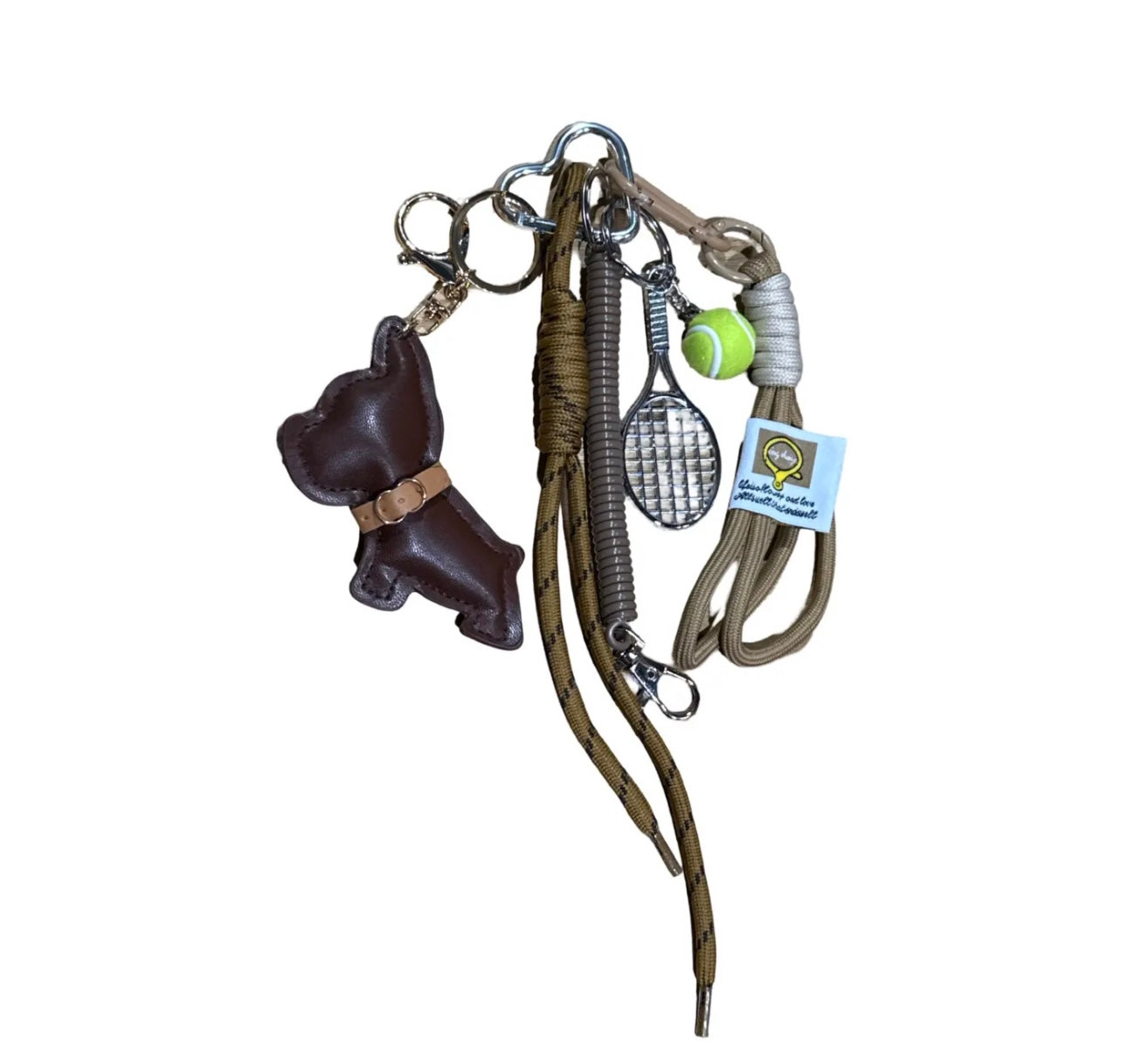 Toujours dans cet esprit rétro 80-90 plein de régression joyeuse, ce bijou de sac met en scène un petit chien stylisé en cuir PU brun, portant un collier beige. Il est accompagné d’une raquette de tennis argentée, d’une mini balle toute douce, et d’un ensemble de cordons noués dans des tons kaki et sable, pour un côté sport chic revisité. Une composition pleine de fantaisie qui rappelle les breloques ludiques d’autrefois.
