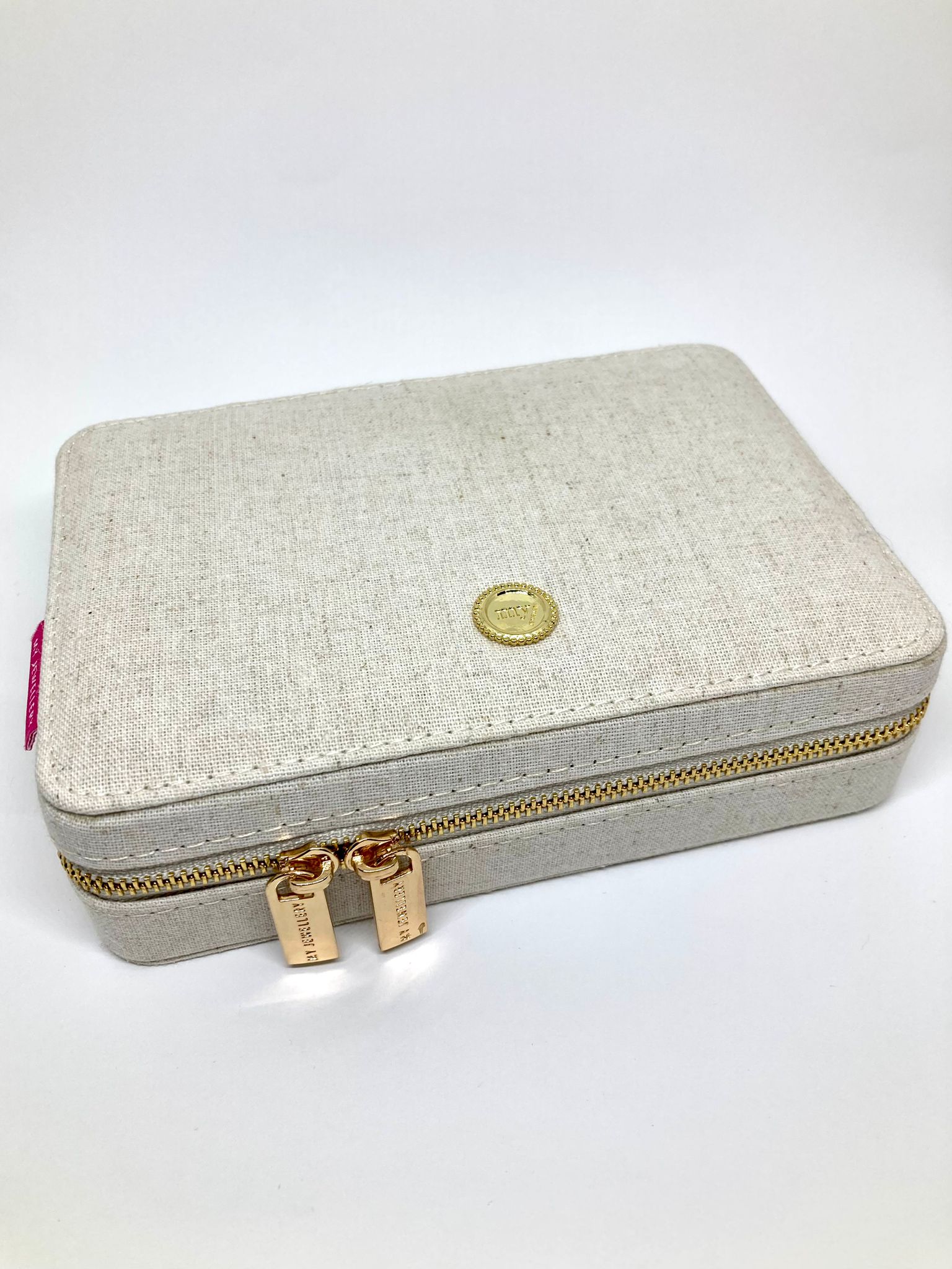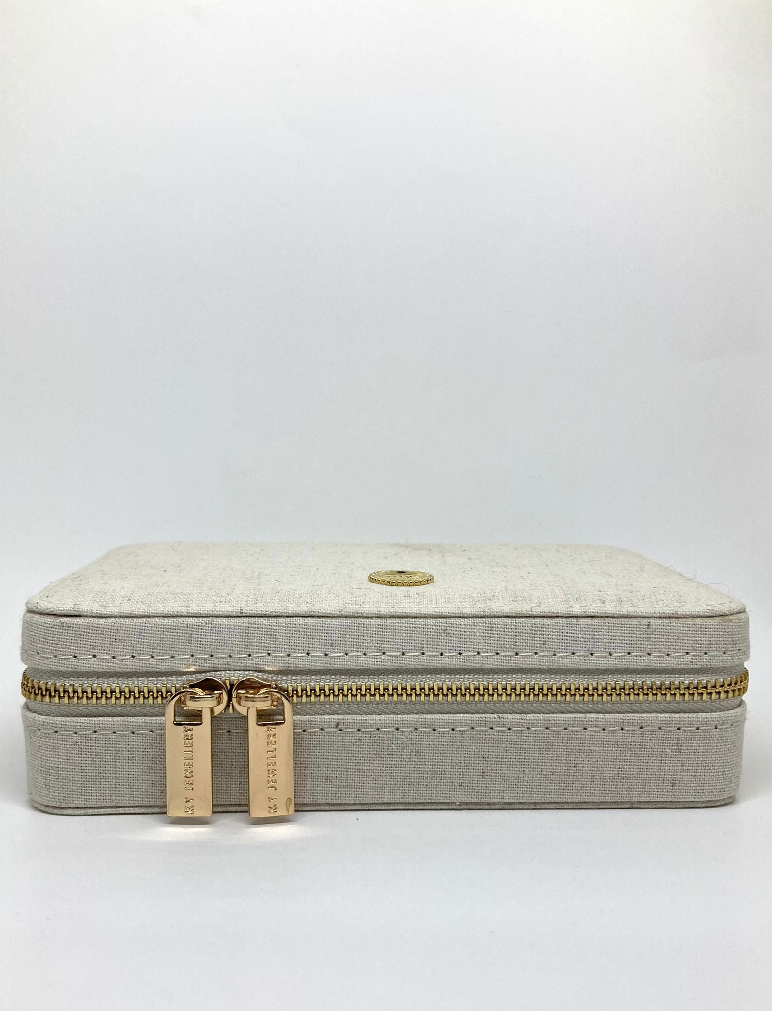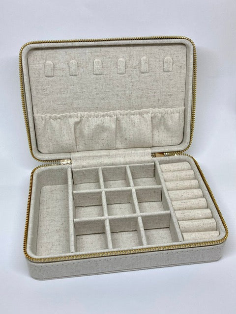 Boîte à bijoux élégante en lin écru, parfaite pour ranger vos bijoux du moment ou pour voyager en toute simplicité.