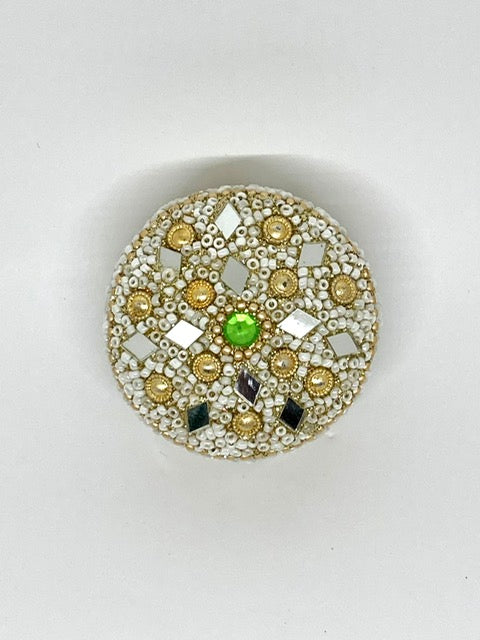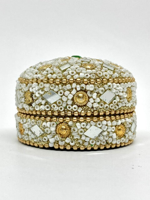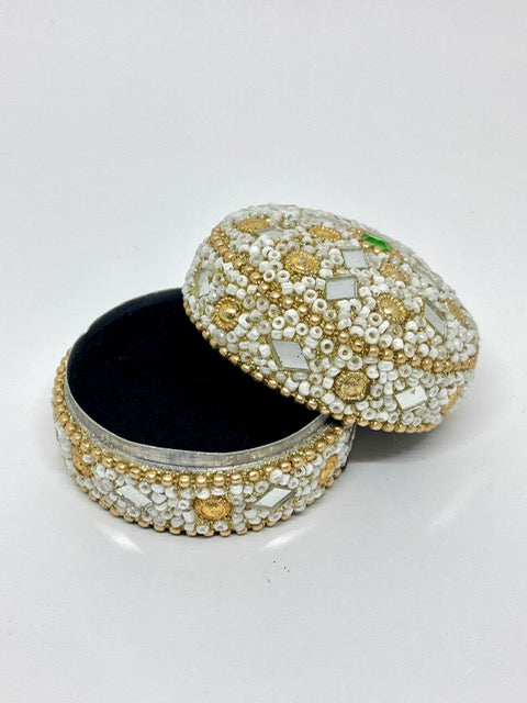Élégante petite boîte ronde entièrement décorée à la main de perles blanches et dorées en Thaïlande. Le couvercle est orné en son centre d’une perle vert émeraude, qui capte la lumière et attire le regard.