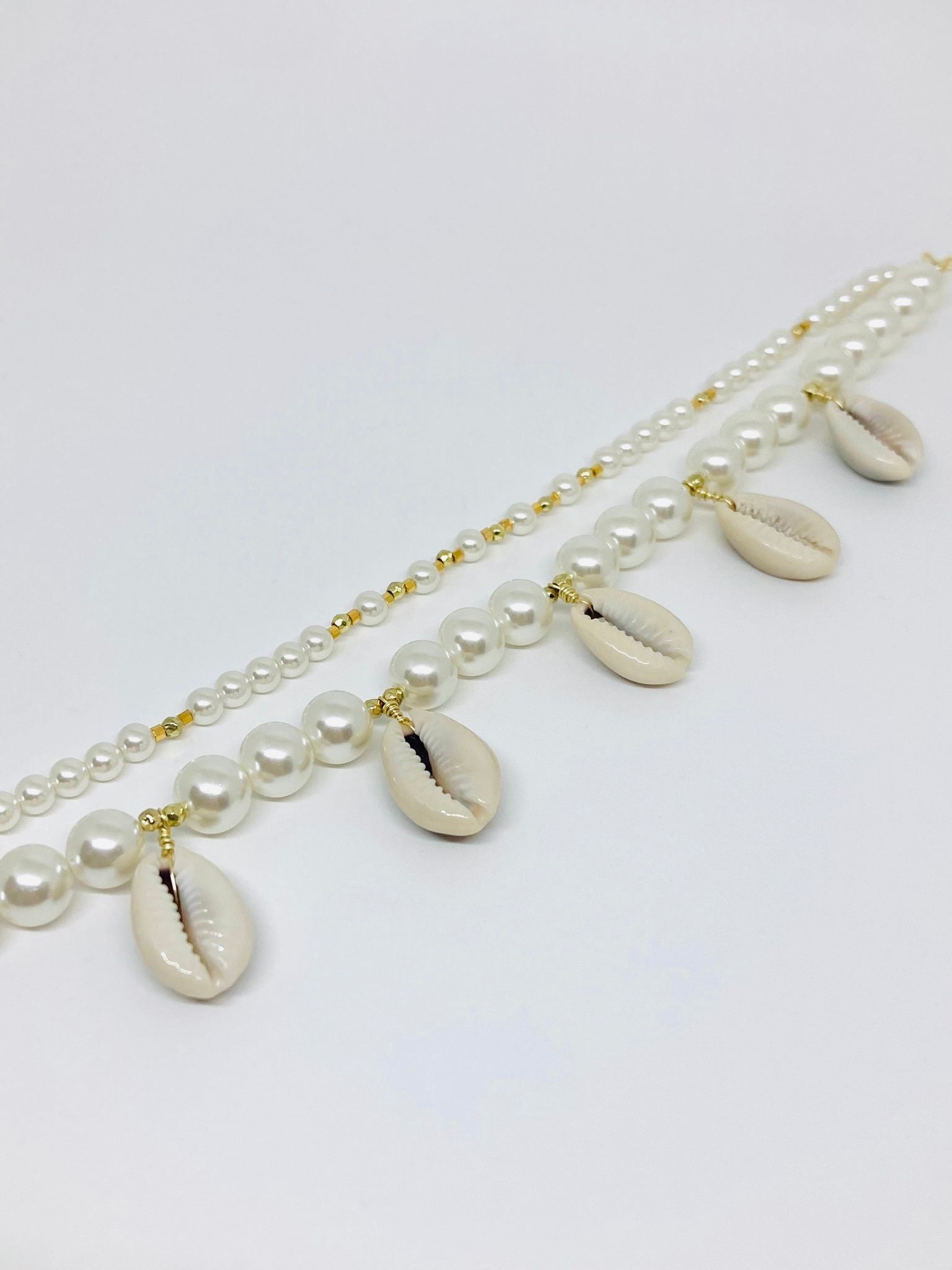Ce bracelet de cheville signé Hipanema réunit sur ses deux liens de délicats coquillages cauris, perles nacrées et perles Miyuki dorées facettées, comme autant de trésors glanés en bord de mer.