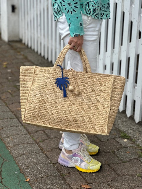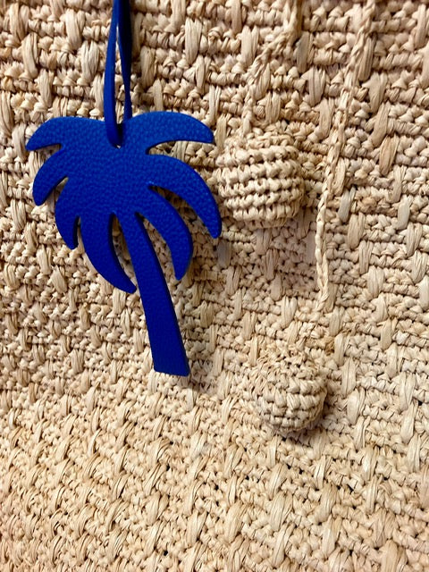 Porté à la main grâce à ses poignées solides, il se distingue par ses pompons en raphia et son bijou de sac en forme de palmier bleu, qui apporte une touche fraîche et joyeuse.
