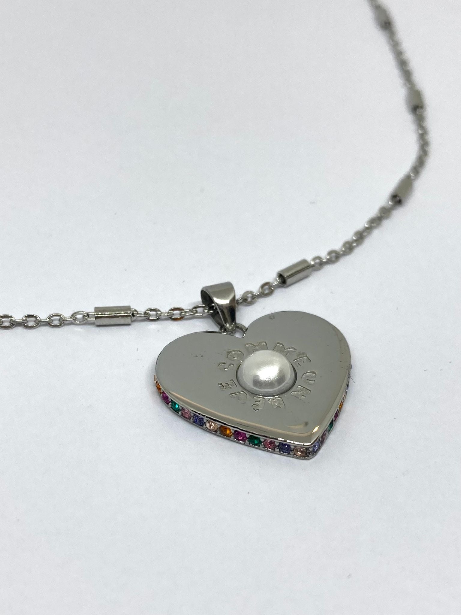 Ce collier cœur en acier inoxydable argenté est un bijou talisman ultra lumineux, gravé de l’inscription “Comme un rêve”, sublimé par une perle de culture centrale et un serti multicolore sur la tranche qui capte la lumière sous tous les angles.