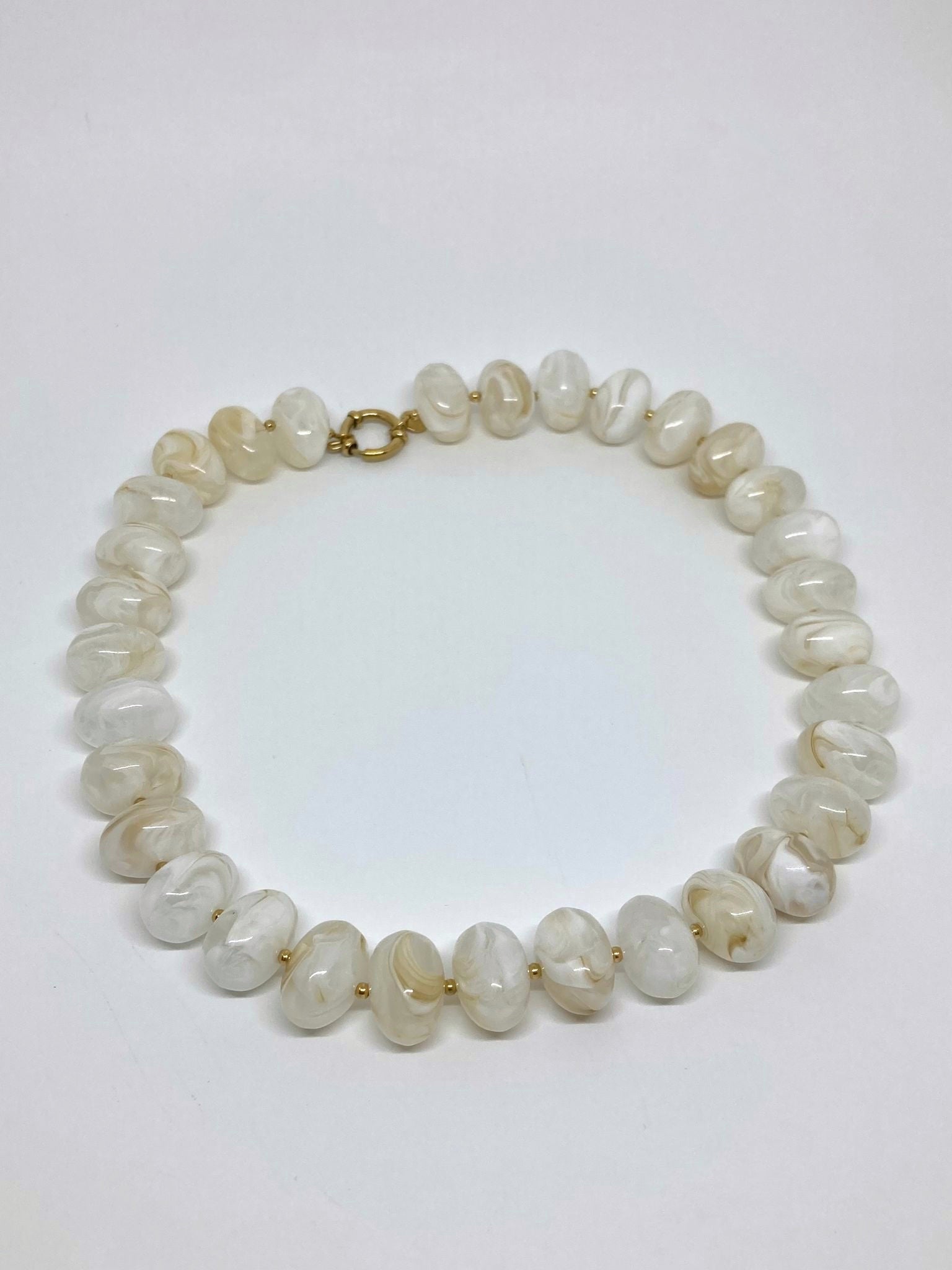 Les perles ont toutes un effet nacré marbré, ce qui donne un collier lumineux, facile à porter aussi bien avec un look habillé que sur un simple tee-shirt basique.