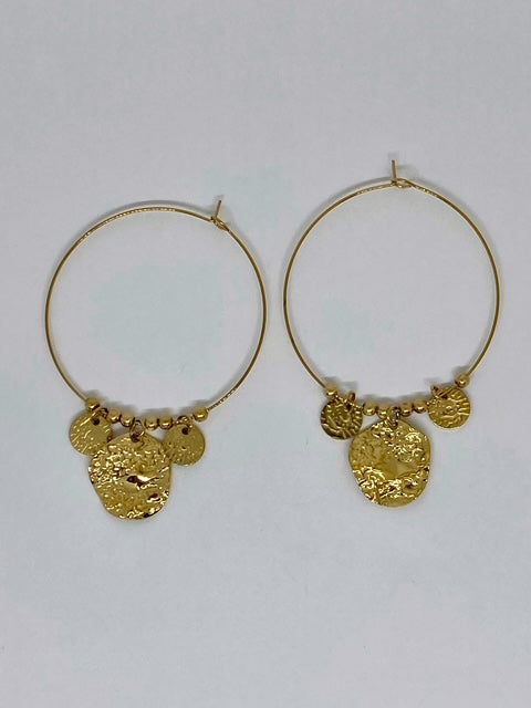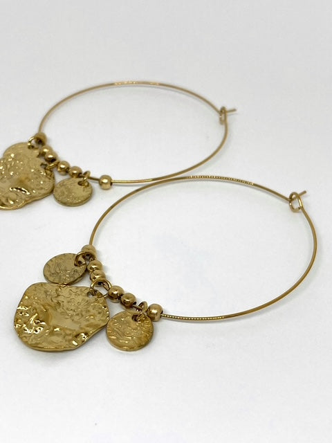 Boucles d’oreilles créoles en acier inoxydable doré, ornées de trois petites médailles martelées (1 grande + 2 petites).