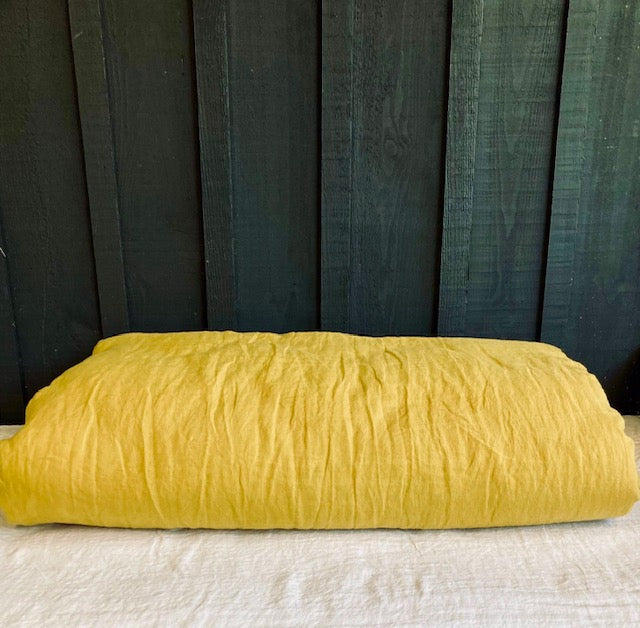 Éclatant et raffiné, cet édredon 100 % lin illumine la pièce de sa teinte jaune tournesol, à la fois chaleureuse et pleine d’énergie.