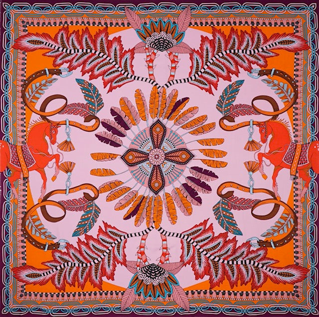 - Ses couleurs éclatantes sur fond rose : orange, rouge brique, lie de vin et turquoise