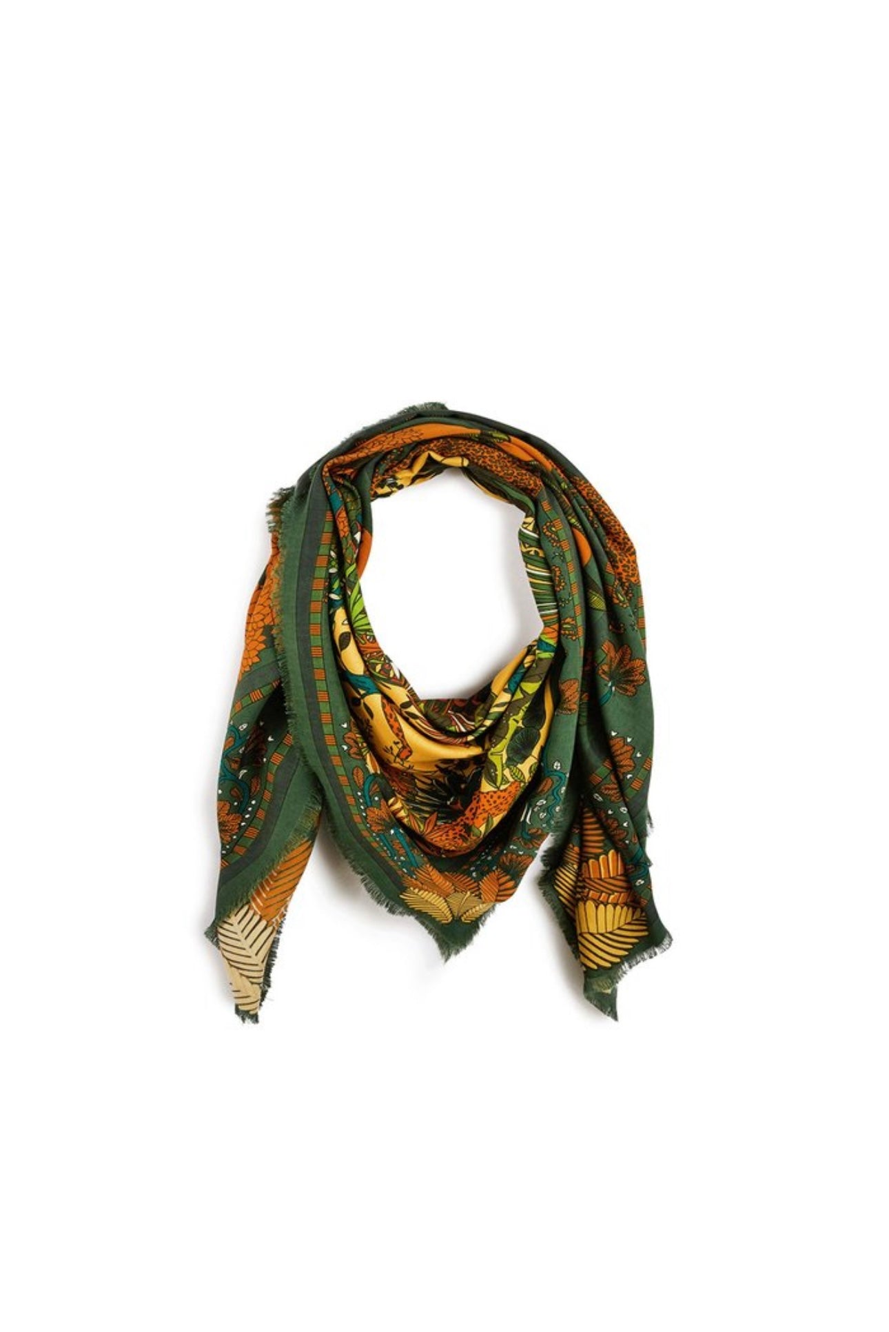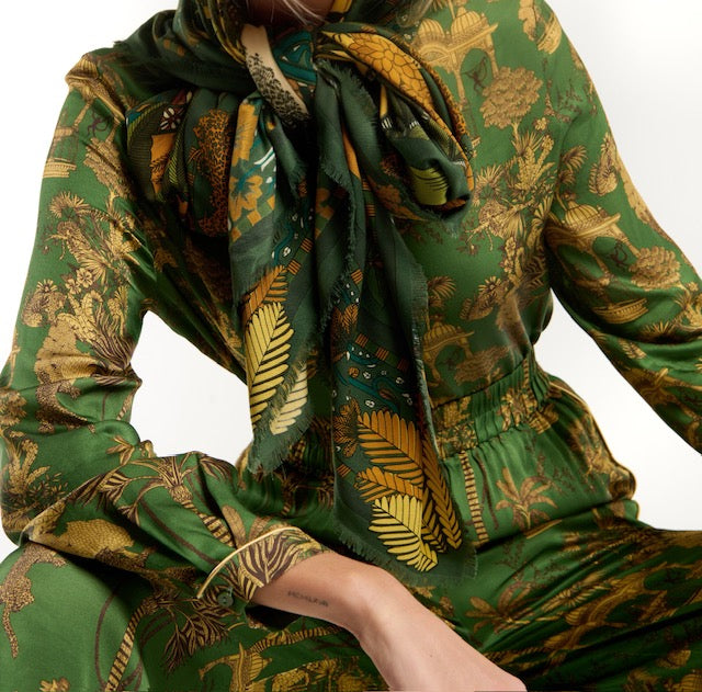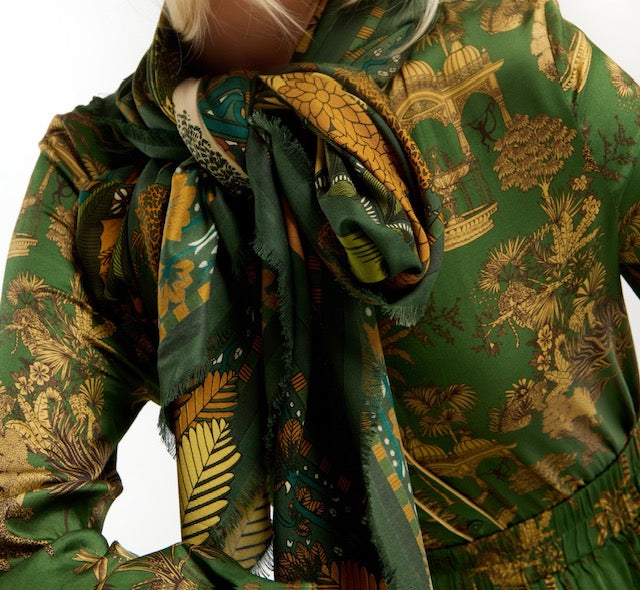 Ce foulard dévoile une scène luxuriante inspirée des jardins orientaux, où se mêlent palmiers, léopards, fontaine et végétation tropicale dans une composition raffinée aux tons vert, ocre et safran.