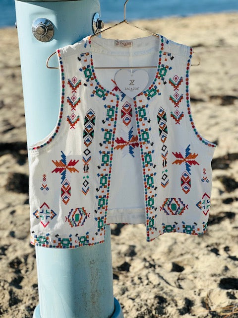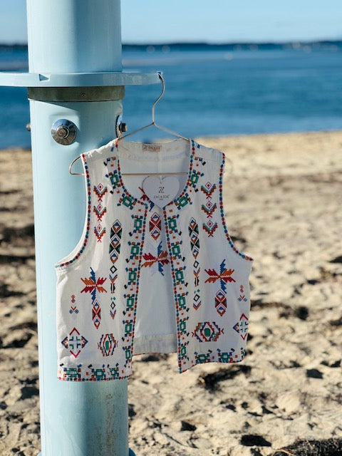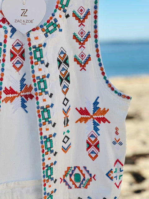 Le gilet, déjà très tendance, s’impose encore plus cette saison ! Ici, il se distingue par de magnifiques broderies colorées, présentes aussi bien sur le devant que dans le dos.