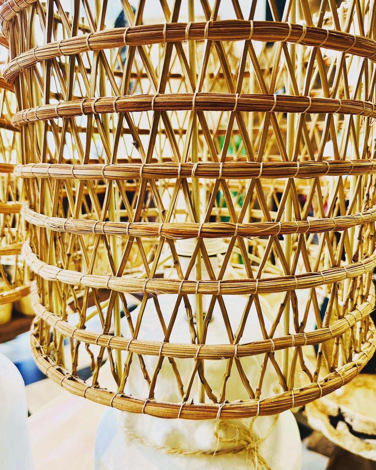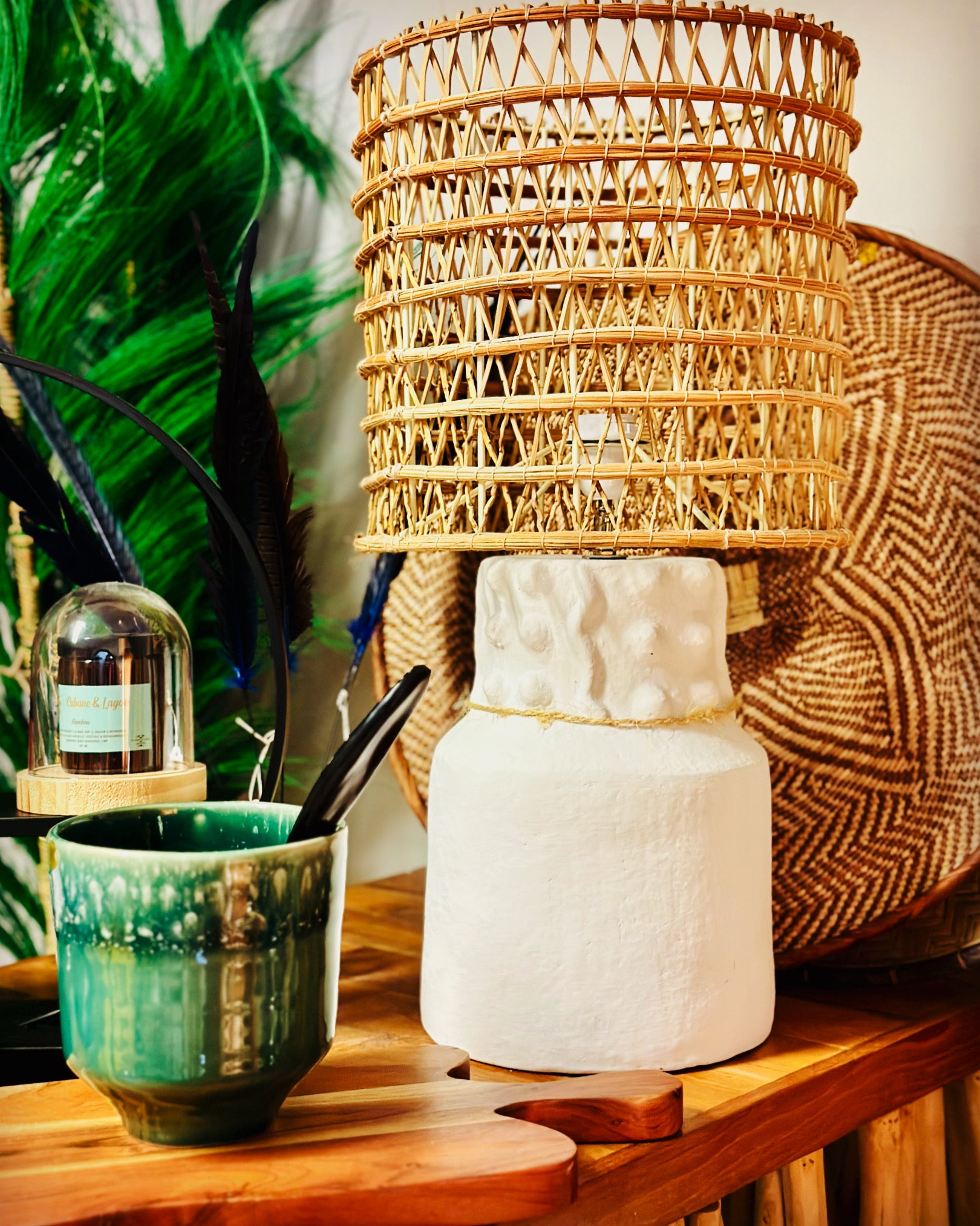 Son abat-jour en fibre de palmier tressée diffuse une lumière chaleureuse et organique, subtilement filtrée à travers les fibres.