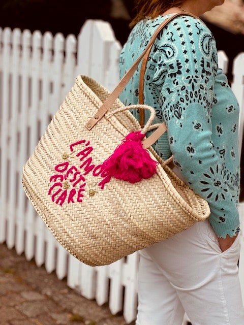 Ses anses en cuir lui confèrent un look à la fois authentique et élégant, tandis que sa broderie rose fuchsia “L’amour est déclaré”, ses pompons assortis et ses trois petits cœurs dorés ajoutent une touche joyeuse et pleine de charme.