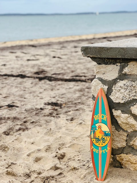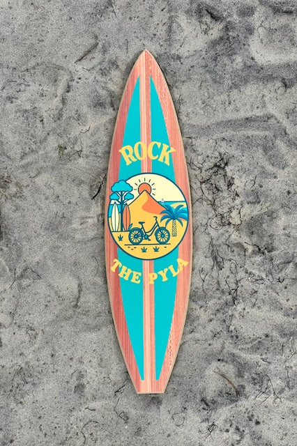 Cette planche de surf décorative “Rock the Pyla” capture à merveille l’esprit vacances, soleil et liberté typique de la côte Atlantique.