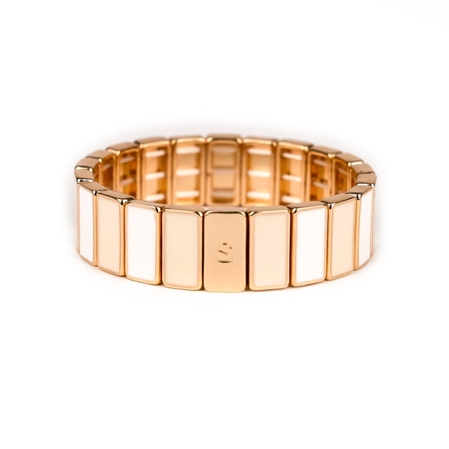 Ce bijou d’exception se distingue par ses maillons rectangulaires dorés et ivoire, subtilement polis pour refléter la lumière avec douceur. Son design minimaliste, à la fois moderne et intemporel, sublime le poignet en toute discrétion.