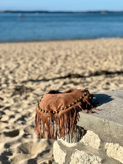 Orné de studs dorés et de longues franges bohèmes, il se porte aussi bien à l’épaule qu’en bandoulière.